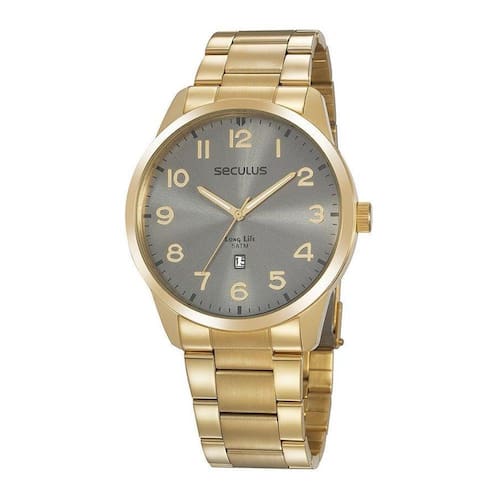 Marca: Seculus Modelo: 20961GPSVDA3 Gênero: Masculino Mecanismo: Analogico com calendario Material da caixa: Aço Material da pulseira: Aço Material do vidro: Cristal Mineral Cor da caixa: Dourado Cor do mostrador: CINZA Tamanho da caixa: 46MM Formato da caixa: Redondo Resistência à água: 5 ATM Garantia: 2 anos Tipo de fecho:Trava de Segurança