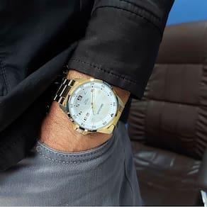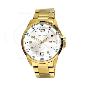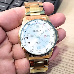 Marca: Seculus Modelo: 20802GPSVDA1 Tipo de relógio: Analógico Gênero: Masculino Cor da caixa: Dourado Cor da pulseira: Dourado Estilo: Casual Alarme: Não Cronômetro: Não Calendário: Sim Luz: Não Resistência à água: Sim – 5 ATM = 50 metros Tipo de fecho: Dobrável, com trava de segurança Material da Caixa: Aço Material da Pulseira: Aço Características do vidro: Cristal Mineral Tamanho da Caixa: 46 mm Espessura da caixa: 11 mm Comprimento da Pulseira: 24 cm Largura da Pulseira: 22 mm Peso: 127 gramas Tampa do fundo: Rosqueado Alimentação: Bateria Garantia do Fabricante: 24 meses Fabricante: Seculus da Amazônia Ind e Com S/A