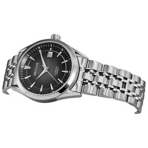 A caixa de 40 mm possui acabamento polido e é protegida por vidro de safira, altamente resistente a riscos. O calendário posicionado às 3 horas conta com lupa aplicada, proporcionando excelente legibilidade no dia a dia. O mostrador preto clássico confere profundidade visual e sofisticação, complementado por marcadores metálicos aplicados e ponteiros com tratamento luminescente, permitindo leitura em ambientes com pouca luz.