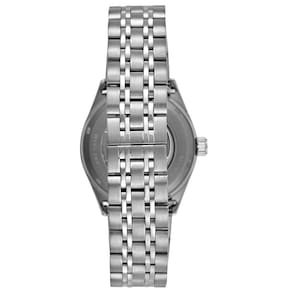 A pulseira em aço inoxidável possui elos sólidos e fecho borboleta com botões laterais, proporcionando segurança e conforto no pulso. O fundo da caixa em vidro transparente permite a visualização do mecanismo interno em funcionamento, um detalhe valorizado por admiradores da relojoaria mecânica.