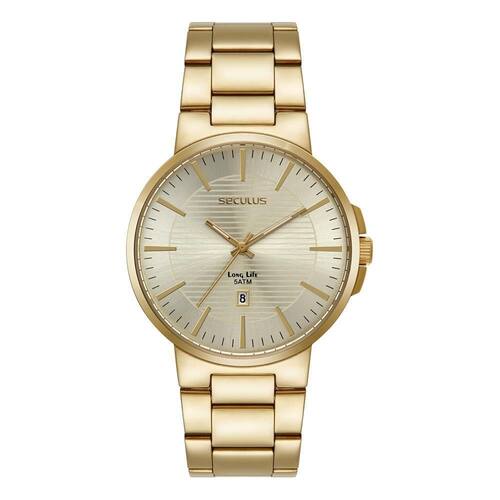 Relógio seculus masculino ref: 23730gpsvda2 casual dourado Descrição do produto: Vidro: cristal mineral Funções: analógico, calendário Resistencia à água: 50 m Características: com caixa de aço inoxidável e pulseira de aço inoxidável Diâmetro da caixa: 4,4 cm Fundo de rosca Linha long life Alimentação do maquinário: bateria Mostrador dourado de 2 anos