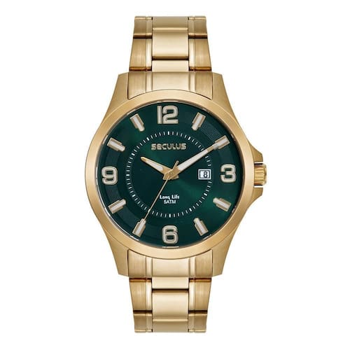 Relógio seculus masculino ref: 23739gpsvda3 casual dourado Descrição do produto: Vidro: cristal mineral Funções: analógico, calendário Resistencia à água: 50 m Características: com caixa de aço inoxidável e pulseira de aço inoxidável Diâmetro da caixa: 4,4 cm Fundo de rosca Linha long life Alimentação do maquinário: bateria Mostrador verde escuro com números de 2 anos Marca: Não Informado Ean: 7909669201984