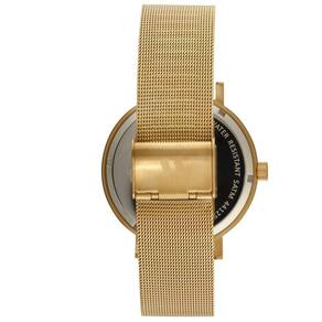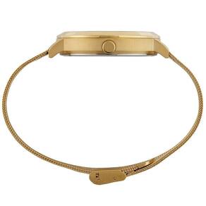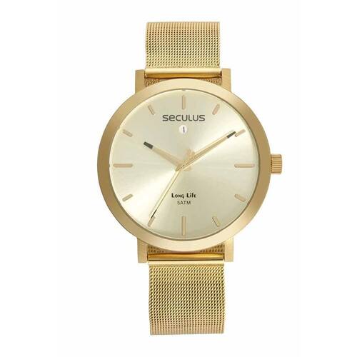 Vidro: cristal mineral Funções: analógico, calendário Resistencia à água: 50 m Características: com caixa de aço inoxidável e pulseira de malha de aço mesh Diâmetro da caixa: 4,5 cm Fundo de rosca Linha long life Alimentação do maquinário: bateria Mostrador dourado