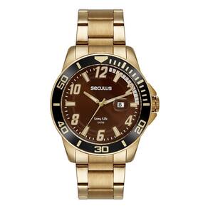 Relógio seculus masculino ref: 44211gpsvda3 esportivo dourado Descrição do produto: Vidro: cristal mineral Funções: analógico, calendário Resistencia à água: 50 m Características: com caixa de aço inoxidável e pulseira de aço inoxidável Diâmetro da caixa: 4,7 cm Fundo de rosca Linha long life Alimentação do maquinário: bateria Mostrador marrom com números e detalhes em branco Aro fixo preto de 2 anos
