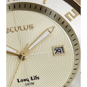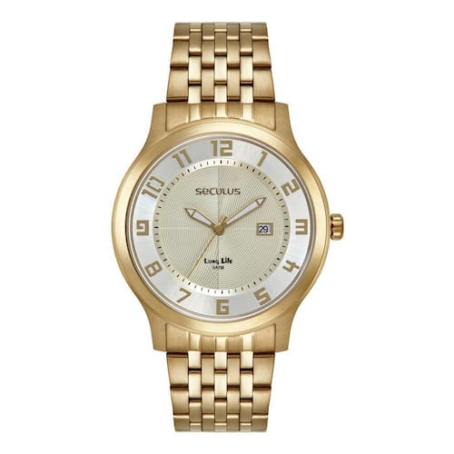 Relógio seculus masculino ref: 44265gpsvda1 social dourado Descrição do produto: Vidro: cristal mineral Funções: analógico, calendário Resistencia à água: 50 m Características: com caixa de aço inoxidável e pulseira de aço inoxidável Diâmetro da caixa: 4,4 cm Fundo de rosca Linha long life Alimentação do maquinário: bateria Mostrador dourado com todos os números de 2 anos