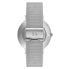 Vidro: cristal mineral Funções: analógico, calendário Resistencia à água: 50 m Características: com caixa de aço inoxidável e pulseira de malha de aço mesh Diâmetro da caixa: 4,4 cm Fundo de pressão Alimentação do maquinário: bateria Mostrador branco com todos os números