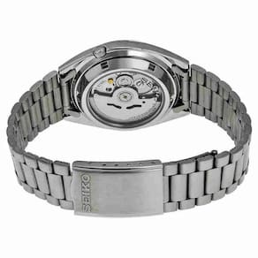 Relógio seiko 5 automático cinza snxs75 Caixa de aço inoxidável com uma pulseira de aço inoxidável. Painel frontal fixo de aço inoxidável. Mostrador cinza com ponteiros em tom de ouro amarelo luminoso e marcadores de horas de índice. Marcadores de minutos em torno da borda exterior. Tipo de discagem: analógico Ponteiros e marcadores luminescentesExibição de dia e data na posição de 3 horasCristal hardlex resistente a arranhões Puxe / empurre a coroaCaixa de fundo esqueletoForma redonda Tamanho da caixa: 37 mmEspessura da caixa 12 mm Largura da pulseira 18 mm Resistente à água a 30 metros Estilo de relógio casualEtiqueta do relógio:japan movt