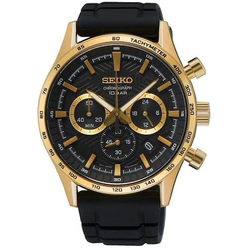 Características Formato do relógio: redondo Composição do vidro: safira Material da caixa: aço inox Cor da caixa: dourado Cor do mostrador: preto Material da pulseira: borracha Cor da pulseira: preto Mecanismo: analógico multifunção