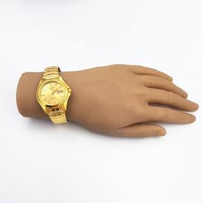 Características Formato do Relógio: Redondo Composição do Vidro: Cristal mineral Material da Caixa: Aço Inox Cor da Caixa: Dourado Cor do mostrador: Dourado Material da Pulseira: Aço Inox Cor da Pulseira: Dourado Mecanismo: Automático-Mecânico