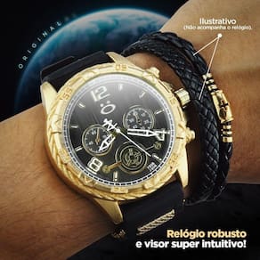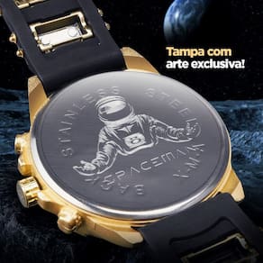 Redefina o seu estilo com o elegante e impecável Relógio Masculino Orizom Spaceman. Com seu design dourado e fundo preto, este relógio é uma verdadeira afirmação de bom gosto e sofisticação para homens que valorizam cada detalhe.