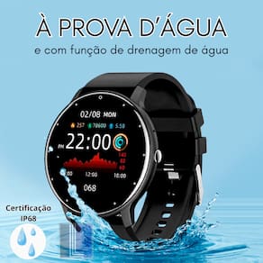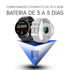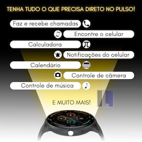 Smartwatch redondo com tela LCD de 1.38 polegadas, caixa de 45mm. Permite fazer e receber chamadas, receber notificações de aplicativos, controlar mídia, usar como disparador remoto de câmera e função 'Encontre Meu Celular'. Monitora sono, dados corporais, lembretes de sedentarismo e saúde menstrual. Possui modo esportivo multimodal, GPS conectado (via celular), contagem de passos e calorias. Inclui agenda, calculadora, alarme, temporizador e previsão do tempo. Tela personalizável, à prova d'água (adequado para natação), tela sensível ao toque e modo teatro. Bateria com duração de até 5 dias (uso básico) ou 3 dias (uso intensivo), com carregamento rápido em 2 a 2,5 horas. Modo de economia de bateria.Processador