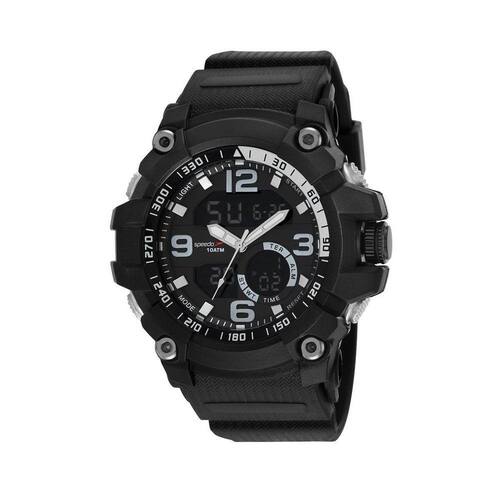 Relógio speedo masculino ref: 81129g0evnp8 esportivo oversized anadigi Descrição do produto: Funções: anadigi, iluminação, alarme, cronógrafo Resistência à água: 100 m Diâmetro da caixa: 54 mm Características: com caixa em policarbonato e pulseira em poliuretano Fundo parafusado Vidro: acrílico Alimentação do maquinário: bateria Garantia de 1 ano