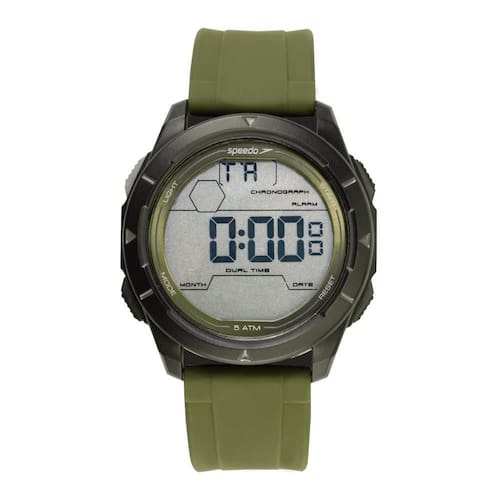 Funções: digital, iluminação, alarme, cronógrafo, timer, dual time Resistência à água: 50 m Diâmetro da caixa: 47 mm Características: com caixa em policarbonato preto e pulseira em silicone verde/preto Fundo parafusado Vidro: acrílico Aro fixo preto Alimentação do maquinário: bateria Garantia de 1 ano