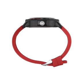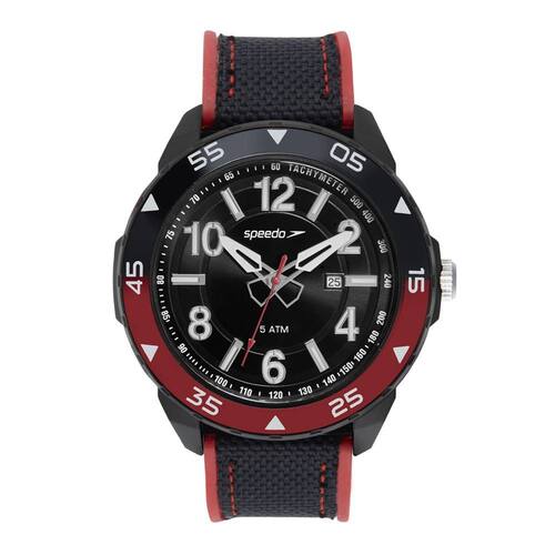Características: com caixa em Policarbonato Preto e pulseira em Silicone Vermelho com detalhe em tecido Preto