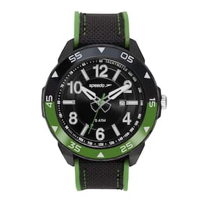 Funções: analógico, calendário Resistência à água: 50 m Diâmetro da caixa: 50 mm Características: com caixa em policarbonato preto e pulseira em silicone verde com detalhe em tecido preto Fundo parafusado Vidro: acrílico Alimentação do maquinário: bateria Aro fixo preto/verde Mostrador preto com números e detalhes em branco Garantia de 1 ano