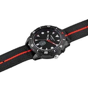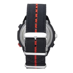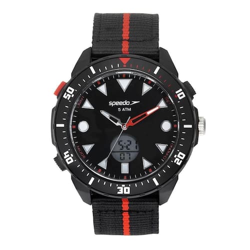 Funções: anadigi, iluminação, alarme, cronógrafo Resistência à água: 50 m Diâmetro da caixa: 51 mm Características: com caixa em policarbonato preta e pulseira em tecido preto/vermelho Fundo parafusado Vidro: acrílico Alimentação do maquinário: bateria Mostrador preto Garantia de 1 ano