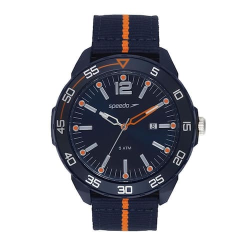 Relógio speedo masculino ref: 15130g0evng3 esportivo analógico Descrição do produto: Funções: analógico, calendário Resistência à água: 50 m Diâmetro da caixa: 50 mm Características: com caixa em policarbonato azul e pulseira em tecido azul/laranja Fundo parafusado Vidro: acrílico Alimentação do maquinário: bateria Aro fixo azul Mostrador azul com número de 1 ano Marca: Não Informado Ean: 7909669173205
