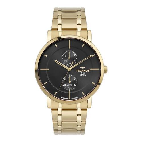 Relógio technos 6p23ap/1p 6p23ap 1p dourado analógico slim Relógio de pulso Technos 6p23ap/1p Analógico Caixa em aço inox Pulseira em aço inox Vidro cristal mineral Mostrador preto Prova dágua 50 metros 5 atm Fundo pressão Fecho duplo Largura da caixa: 42,2 mm Largura da caixa com coroa: 45,1 mm Espessura da caixa: 8,7 mm Largura de pulseira: 20 mm Analógico Mostrador de horas/minutos/segundos Ponteiro 24 horas Calendário analógicos dia da semana Acompanha Embalagem Manual de instrução Certificado de Marca: Não Informado