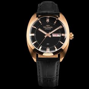Mecanismo: Automático - Miyota com 21 Jewels - Reserva de marcha de 42h. Gênero: Masculino Visor: Preto Vidro: Cristal Mineral Funções: Calendário day-date, case back transparente Prova d'água: 50m Características: Com caixa e pulseira em couro Diâmetro da caixa: 40 mm Garantia: 1 ano pelo fabricante Technos