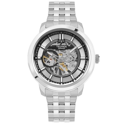 Relógio Technos Automático com caixa e pulseira de aço inoxidável. O modelo apresenta fundo de vidro, com maquinismo automático skeleton visível no mostrador, além da pulseira de elos 5 links. Produto com tamanho de caixa 46mm e resistência à água de 50m.