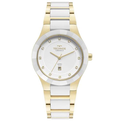 Relógio technos ceramic com aplicação de pedras nos marcadores de hora, aro externo com acabamento facetado e assinatura de linha no mostrador. Elegante, seu diferencial está nos materiais utilizados em sua composição: feito em aço inoxidável em banho dourado, ele apresenta aplicação de cerâmica branca na pulseira e no aro externo da caixa, além de possuir vidro de safira, ambos altamente resistentes a riscos e arranhões. Produto com máquina quartz japonesa miyota, calendário e resistência à água de 50m. Tamanho de caixa 38mm.