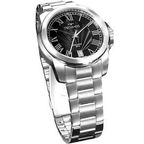 A caixa do relógio é feita em aço inoxidável na cor prata, o que confere durabilidade e resistência ao produto. Seu mostrador é na cor preta, com assinatura de linha, numeração romana e aplicação de textura discreta, garantindo um visual elegante e atemporal.