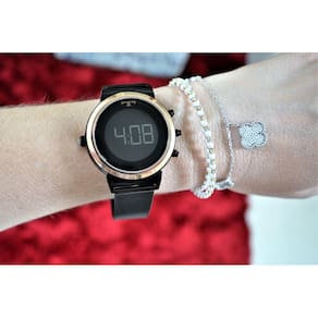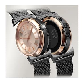 Relógio Technos feminino Coleção Curvas. Edição limitada em homenagem a Oscar Niemeyer, ícone da arquitetura mundial, um brasileiro que sempre esteve à frente do tempo. Com construção reversível inovadora, eles possuem uma caixa com dois lados, sendo um analógico e outro digital, basta puxar a pulseira para girar a caixa. Modelo com caixa tamanho 4,0cm e pulseira de aço mesh em banho rosé. Resistente à água em até 50 metros.