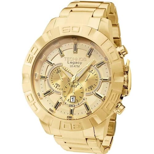 Relógio technos masculino com caixa e pulseira de aço. O reconhecido modelo big case possui caixa robusta e ganha força com o banho dourado, ideal para homens com personalidade e que desejam se destacar.