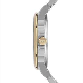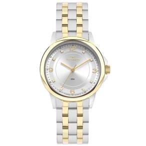 Com design moderno e traços tradicionais, o modelo bicolor prata com dourado da linha Boutique apresenta mostrador com numeração e aplicação de pedras nos marcadores de hora. Produto em aço inoxidável, com máquina quartz japonesa e resistência à água de 50m.