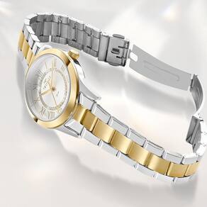 Sua caixa de 32mm apresenta proporções equilibradas, garantindo conforto e presença discreta no pulso. O acabamento bicolor, que combina tons de prata e dourado, confere versatilidade ao visual, facilitando a combinação com diferentes estilos e acessórios. O mostrador claro com algarismos romanos proporciona excelente leitura e reforça o caráter clássico do modelo, enquanto o aro interno com aplicação de pedras decorativas adiciona um toque sutil de brilho e elegância.