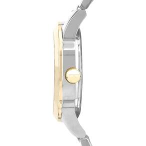 A pulseira em aço bicolor complementa o conjunto com resistência e conforto, oferecendo ajuste seguro para o uso prolongado. Equipado com mecanismo de quartzo de alta precisão e resistência à água de 50 metros, este relógio foi desenvolvido para acompanhar a rotina com confiabilidade, estilo e durabilidade.