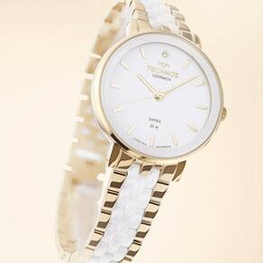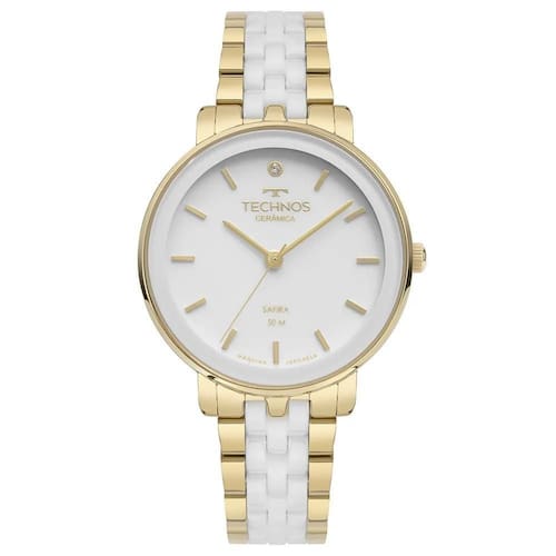 O Relógio Technos Feminino Ceramic Sapphire - 2035MZL/1B une design elegante com materiais nobres, resultando em uma peça luxuosa e funcional. Sua caixa de 36 mm tem acabamento dourado e mostrador branco com marcadores dourados e detalhe em cristal às 12h, trazendo leveza e sofisticação ao visual.