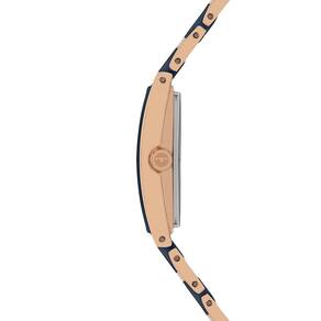 Seu formato retangular reforça a proposta moderna e elegante, enquanto o mostrador azul traz profundidade e estilo ao conjunto. Os marcadores com aplicação que remetem a pedras adicionam brilho na medida certa, proporcionando um toque delicado e sofisticado sem perder a discrição.