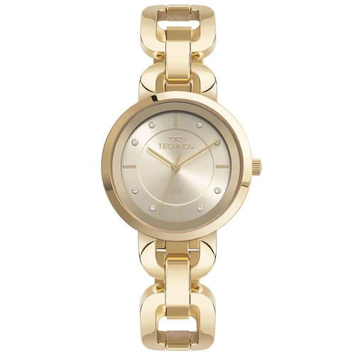 Relógio Technos Elos com traços marcantes e surpreendentes. Sua pulseira de elos em aço inoxidável sólido, todo polido, oferece um design único, e traz a estética do universo das joias para o modelo, que ainda conta com aplicação de pedras delicadas nos marcadores de hora. Produto 100% em aço inoxidável, com banho dourado, máquina quartz Japonesa Miyota e resistência à água de 50m. Tamanho de caixa 34mm.