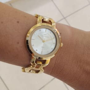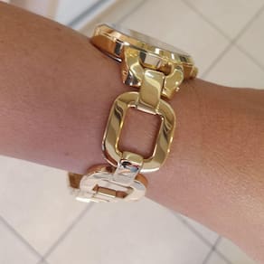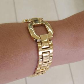 Cor do Aro: Dourado Cor da Caixa: Dourado Cor da pulseira: Dourado Cor do mostrador: Dourado Material da caixa: Aço inox Material da pulseira: Aço inox Pulseira ajustável: Sim Fonte de Energia: Bateria Vidro: Cristal mineral Mecanismo: analógico