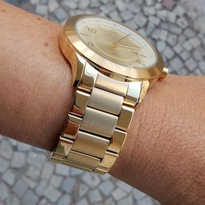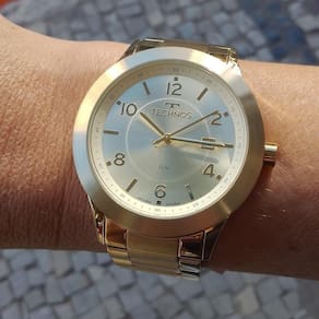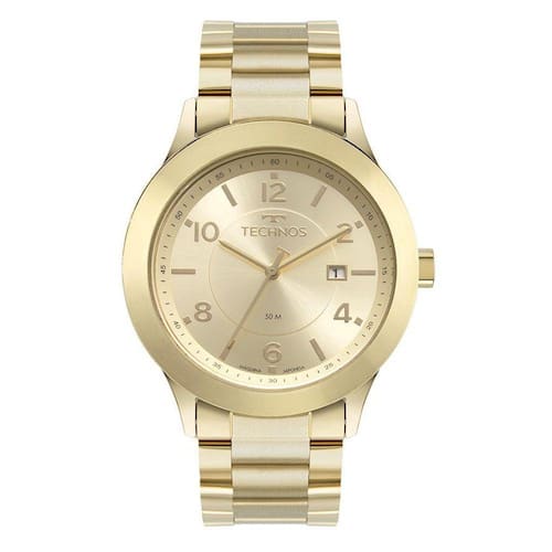 Relogio Technos feminino dourado grande com calendário 2115NCE/1X MEDIDAS:Diâmetro da Caixa: 43,5 mm grande medida sem a coroaDiâmetro da Caixa: 46 mm medida com a coroaEspessura da caixa: 10 mmComprimento da pulseira: 21 cmPeso: 125 gramas GARANTIA:12 meses em toda a rede de Assistências Technos no Brasil Cor do aro: Dourado foscoCor da caixa: DouradoCor do mostrador: Dourado com calendárioCor da pulseira: Dourado Material da caixa: Aço inoxMaterial da pulseira: Aço inox Pulseira ajustável: SimFonte de Energia: BateriaVidro: Cristal MineralMecanismo: analógico RESISTENCIA A AGUA: 50 metros 5atm - Pode lavar as maos SIM- Pode tomar banho de chuveiro SIM- Pode usar em piscina: SIM- Pode usar em mergulho profundo NAO Fabricante: Technos Relogios da Amazonia LTDA ACOMPANHA:- Relogio - Caixinha Technos- Certificado de Garantia