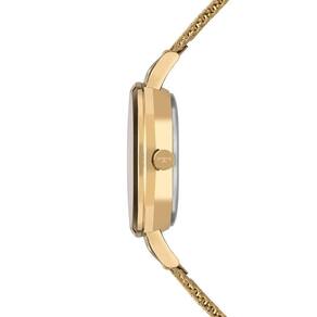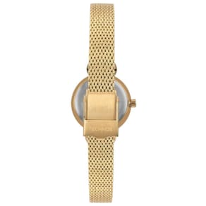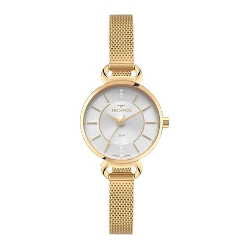 Relógio Mini apresenta seu novo modelo, com mostrador texturizado. Apresenta caixa pequena na cor dourado e aplicação de pedras no mostrador prata, além dos marcadores de hora em indexes. Produto 100% em aço inoxidável, banhado em dourado, com máquina quartz Japonesa Miyota e resistência à água de 50 metros.
