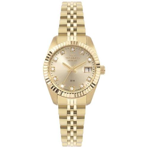 Relógio Technos Feminino Ref: 2015cel/1x Clássico Riviera Dourado Descrição do Produto: Caixa de Aço Inox Pulseira de Aço Inox Fundo de Pressão Resistente à Água 5 Atm Diâmetro / Largura da Caixa: 29.00 MM Vidro de Cristal Mineral Funções: Analógico, Calendário com Lupa Maquina Japonesa Alimentação do Maquinário: Bateria Mostrador Dourado com Pedras