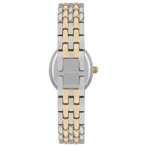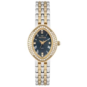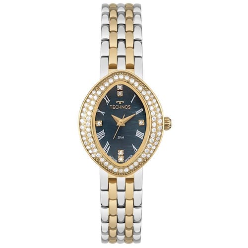 Relógio Technos Feminino Ref: 2035nbo/1a Ovalado Bicolor Descrição do Produto: Caixa de Aço Inox Pulseira de Aço Inox Fundo Resistente à Água 5 Atm Diâmetro / Largura da Caixa: 24.00 MM x 30.00 MM Vidro de Cristal Mineral Funções: Analógico Maquina Japonesa Alimentação do Maquinário: Bateria Mostrador Madreperola Azul com algarismos romanos e pedras Aro Externo de Pedras Prateado com Dourado de 1 Ano