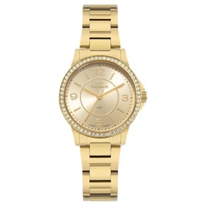 Relógio Technos Feminino Ref: 2035ncg/1x Elegance Dourado Descrição do Produto: Caixa de Aço Inox Pulseira de Aço Inox Fundo Rosqueado Resistente à Água 5 Atm Diâmetro / Largura da Caixa: 32.00 MM Vidro de Cristal Mineral Funções: Analógico Maquina Japonesa Alimentação do Maquinário: Bateria Mostrador Dourado com números Aro Externo de pedras de 1 Ano