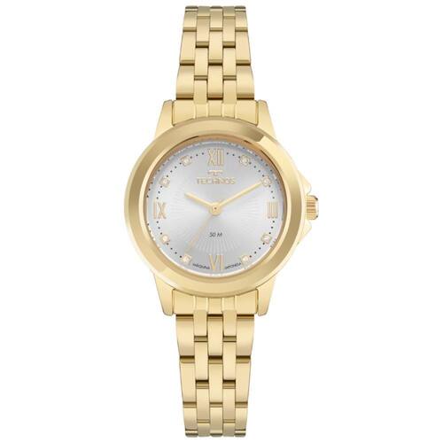 Relógio Technos Feminino Ref: 2036naz/1k Elegance Dourado Descrição do Produto: Caixa de Aço Inox Pulseira de Aço Inox Fundo Resistente à Água 5 Atm Diâmetro / Largura da Caixa: 30.00 MM Vidro de Cristal Mineral Funções: Analógico Maquina Japonesa Alimentação do Maquinário: Bateria Mostrador Prateado com algarismos romanos e pedras de 1 Ano