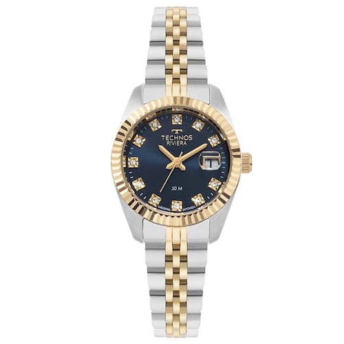 Relógio Technos Feminino Riviera Bicolor - 2015cem/1a Relógio Technos Riviera feminino com caixa e pulseira de aço em banho bicolor prata com dourado. Enaltecendo a essência dos clássicos, o modelo possui o icônico aro externo corrugado e vidro com lupa de calendário, ambos elementos tradicionais do universo relojoeiro. Além da pulseira diferenciada 5 links, ele apresenta mostrador de cor champanhe, que conta com a aplicação de pedras nos marcadores de hora. Produto 100% em aço inoxidável, com máquina quartz japonesa, calendário e resistência à água de 50m. Banho - Bicolor Tipo - Analógico Cor da Caixa - Prata Material da Pulseira - Aço Formato - Redondo Cor do Mostrador - Azul Tipo de Fecho - Trava Lateral Garantia - 12 meses Cor da Pulseira - Bicolor Largura da Caixa (cm) - 2,9 Resistência à Água - 5 ATM plaintext_description_meli - Relógio Technos Feminino Riviera Bicolor - 2015CEM/1A meli_title - Relógio Technos Feminino Riviera Bicolor - 2015CEM/1A Modelo_ML - Relógio Technos Feminino Riviera Bicolor - 2015CEM/1A Cor - Bicolor Tamanho - Pequeno Gênero - Feminino