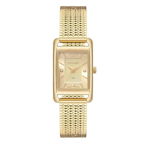 Sua caixa de 23mm em aço inox dourado apresenta formato retangular com mostrador texturizado e dois marcadores de horas com brilho sutil, trazendo charme e requinte ao visual. A pulseira em malha de aço dourada complementa com leveza e conforto, mantendo o estilo clássico e luxuoso.
