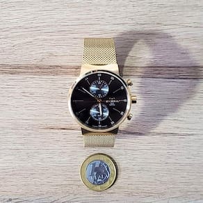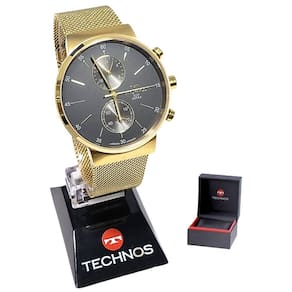 Marca: Technos Modelo: VD36AA/1P Tipo de relógio: Analógica Gênero: Masculino Cor da caixa: Dourado Cor da pulseira: Dourado Estilo: Casual Alarme: Não Cronógrafo: Sim Calendário: Não Luz: Não – ponteiros fluorescentes Resistência à água: Sim – 5 ATM = 50 metros Tipo de fecho: Fivela de gancho Material da Caixa: Aço Inoxidável Material da Pulseira: Mesh de Aço Inoxidável Características do vidro: Safira Tamanho da caixa: 40 mm Espessura da caixa: 10 mm Comprimento da pulseira: 22 cm Largura da pulseira: 20 mm Tampa do fundo: Pressão Peso: 81 Gramas Alimentação: Bateria Garantia do Fabricante: 12 meses Fabricante: Technos da Amazônia Ind e Com S/A