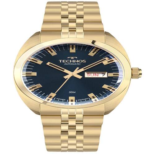 Relógio Technos Masculino Automático Dourado - 8205ON/1A Informações Básicas: - Marca: Technos - Referência: 8205ON/1A - Gênero: Masculino - Coleção: Automático - Estilo: Social - Tamanho: Médio Características do Relógio: - Composição Do Vidro: Cristal Mineral - Material Da Caixa: Aço Inox - Cor Da Caixa: Dourado - Material Da Pulseira: Aço Inox - Cor Da Pulseira: Dourado - Tampa Posterior: Fundo Rosqueado - Fecho: Implantação com trava e botão lateral - Cor do Mostrador: Azul - Formato da Caixa: Redondo - Mecanismo: Analógico - Tipo de Energia: Automático Medidas - Diâmetro Da Caixa: 4,0 cm - Espessura da Caixa: 1,3 cm - Comprimento da Pulseira: 22 cm Resistência à Agua - Wr: 5atm - Pode Lavar As Mãos: Sim - Pode Usar Em Agua Corrente: Sim - Pode Usar Na Piscina: Não - Pode Usar Em Mergulho Profundo: Não Funções Especiais: - Calendário Analógico Duplo Peso do Relógio: 148 gr Informações Importantes: - Manual em Português e Certificado de - de 12 meses do Fabricante Marca: Não Informado