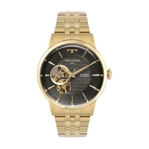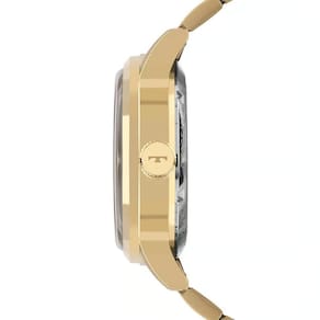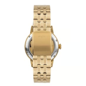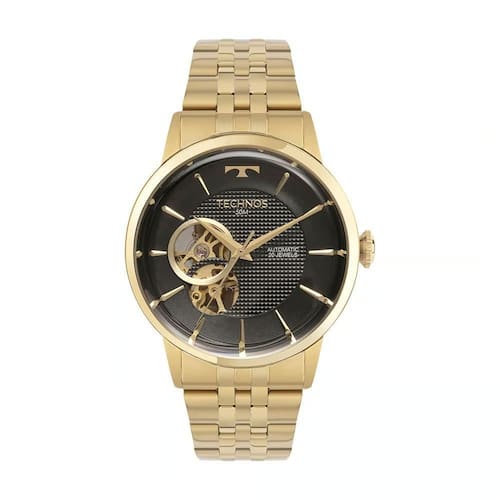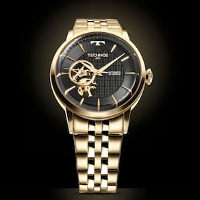 - Composição Do Vidro: Cristal Mineral - Material Da Caixa: Aço Inox - Cor Da Caixa: Dourada - Material Da Pulseira: Aço Inox - Cor Da Pulseira:Dourada - Tampa Posterior: Fundo Rosqueado - Fecho: Implantação com trava lateral de dois botões - Cor do Mostrador: Preto - Formato da Caixa: Redondo - Mecanismo: Automático