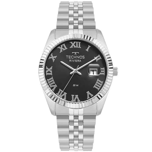 Referência TECHNOS do Brasil 2117LEN/1P Máquina Japonesa movida a bateria / quartzo Mecanismo Analógico com 3 ponteiros Caixa do relógio em aço inoxidável prateado com aro texturizado Pulseira de aço inoxidável prateado Fecho com botões laterais para abertura Mostrador preto Relógio com calendário dia do mês Vidro de Cristal Mineral com lente de aumento no calendário Coroa simples padrão sem rosca Tampa posterior rosqueado Resistência à água 5 ATM 50M Diâmetro da caixa: 40 mm Comprimento: 23 cm Altura: 11 mm Peso: 108 g Acompanha: Manual + + Embalagem . Ean: 7891530753862