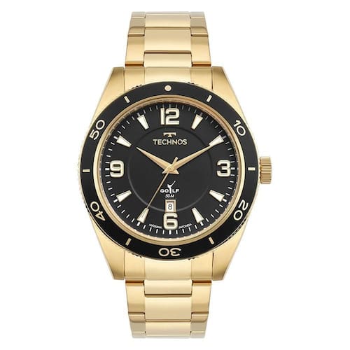 Relógio Technos Masculino Golf Dourado - 2115twj/1p 2115twj/1p Novas versões de modelo best-seller da linha Golf. Ele apresenta um elegante aro de alumínio com acabando fosco, mostrador preto e com a assinatura de linha. Material da caixa aço inoxidável, pulseiras disponíveis de aço inoxidável em 3 links ou couro na cor marrom, tamanho da caixa 45mm, resistência de até 50 metros na água, posição do calendário nas 6h disposníveis nos banhos dourado ou bicolor prata e dourado. Produto 100% em aço inoxidável, com máquina quartz japonesa Miyota. Banho - Dourado Tipo - Analógico Cor da Caixa - Dourado Material da Pulseira - Aço Formato - Redondo Cor do Mostrador - Preto Tipo de Fecho - Trava Lateral Garantia - 12 meses Cor da Pulseira - Dourado Largura da Caixa (cm) - 4,5 Resistência à Água - 5 ATM plaintext_description_meli - Relógio Technos Masculino Golf Dourado - 2115TWJ/1PNovas versões de modelo best-seller da linha Golf. Ele apresenta um elegante aro de alumínio com acabando fosco, mostrador preto e com a assinatura de linha. Material da caixa aço inoxidável, pulseiras disponíveis de aço inoxidável em 3 links ou couro na cor marrom, tamanho da caixa 45mm, resistência de até 50 metros na água, posição do calendário nas 6h disposníveis nos banhos dourado ou bicolor prata e dourado. Produto 100% em aço inoxidável, com máquina quartz japonesa Miyota. meli_title - Relógio Technos Masculino Golf Dourado - 2115TWJ/1P Modelo_ML - Relógio Technos Masculino Golf Dourado - 2115TWJ/1P Cor - Dourado Tamanho - Grande Gênero - Masculino