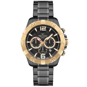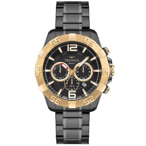 Relógio Legacy apresenta seu mais novo lançamento. Com mostrador texturizado na cor preto com detalhes em profundidade e assinatura de linha, o relógio também conta com caixa robusta, cronógrafo e aro externo banhado em dourado trabalhado em relevos. Produto 100% em aço inoxidável, resistente à água de 100 metros.