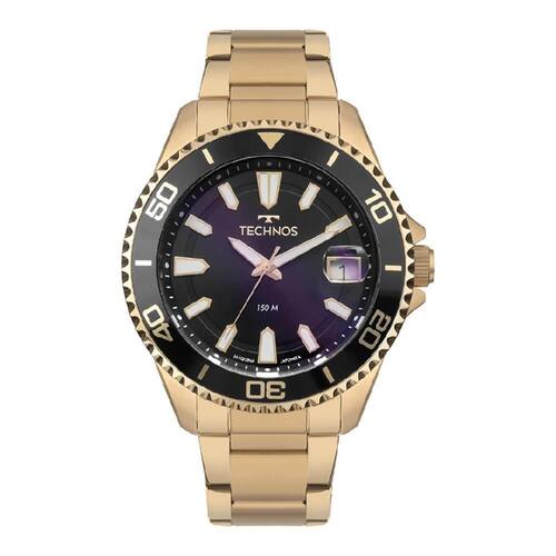 Relógio Technos Masculino Ref: 2415ei/1p Acqua Diver Dourado Descrição do Produto: Caixa de Aço Pulseira de Aço Vidro: Cristal Mineral Camaleão Fundo de Rosca Resistente à Água 15 Atm Diâmetro / Largura da Caixa: 44.00 MM Funções: Analógico, Calendário com Lupa Alimentação do Maquinário: Bateria Mostrador Preto Aro Giratório Preto com Números Maquinário Japonês de 1 Ano Marca: Não Informado